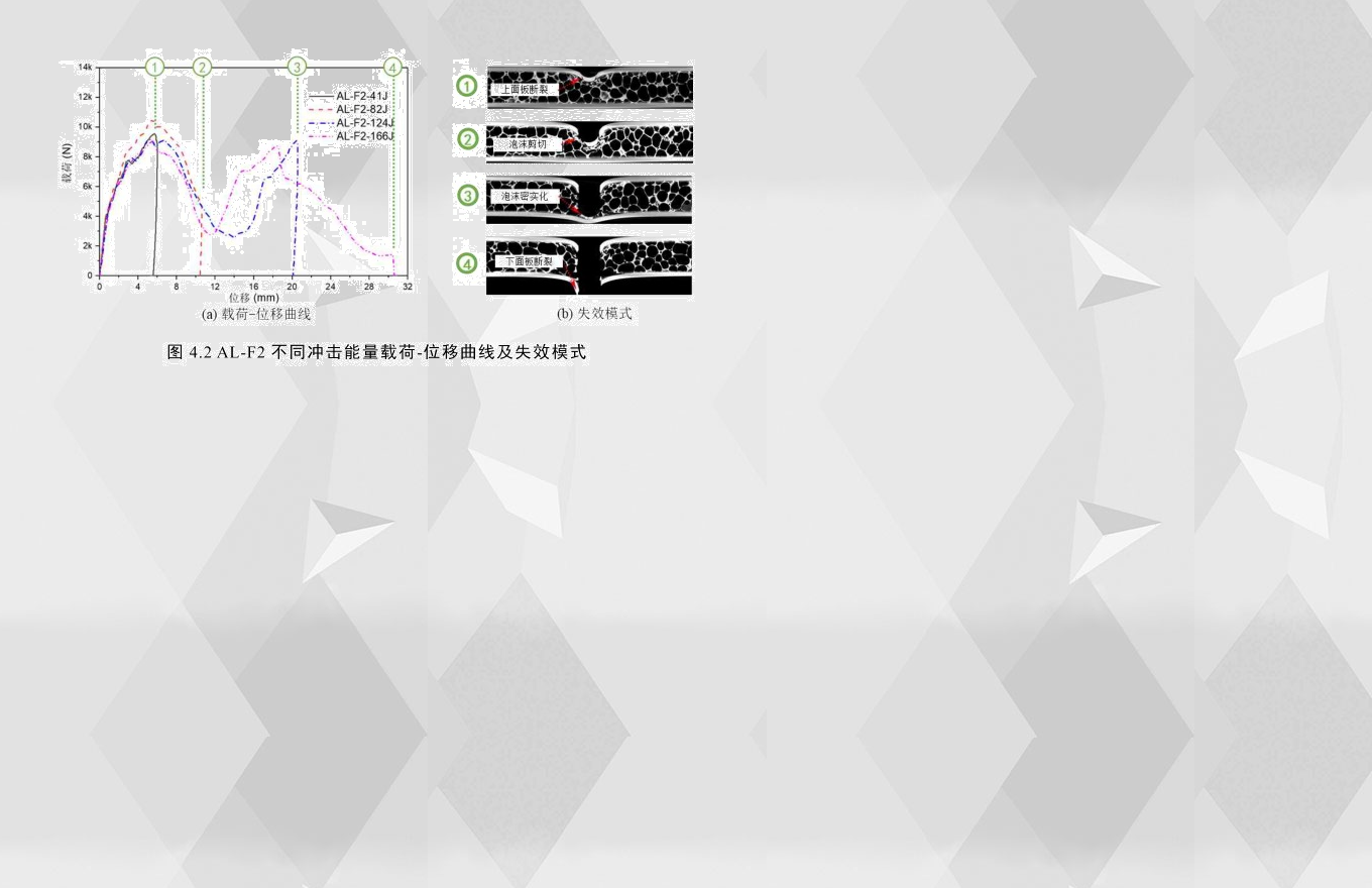 圖4.2為AL-F2在不同沖擊能量下的載荷-位移曲線及失效模式,AL-F2在166J沖擊能下試件完全穿透,其載荷-位移曲線有兩個峰值載荷,結合其在不同沖擊能量下最終損傷CT掃描圖,如圖4.2(b)所示,可以將結構響應分為三個階段,第一階段為沖頭接觸到上面板到抵達第一次峰值載荷,由于這個過程半球狀沖頭與面板的接觸面積不是線性增長且面板逐漸發生塑性變形,所以此階段的載荷呈非線性增長,當上面板出現裂紋時,如圖4.2(b)中①,載荷到達第一個峰值載荷;第二階段為第一次峰值載荷到第二次峰值載荷,在此階段的前半階段載荷持續下降到波谷,主要的失效模式為上面板裂紋的出現以及擴展,與此同時,泡沫芯層受到一定程度的壓潰,在第二階段的后半階段,由于泡沫鋁芯層被壓實至密實化,如圖4.2(b)中③所示,載荷再一次持續上升;第三階段即為第二次峰值載荷之后,開始于下面板出現裂紋到結構完全失去承載能力。